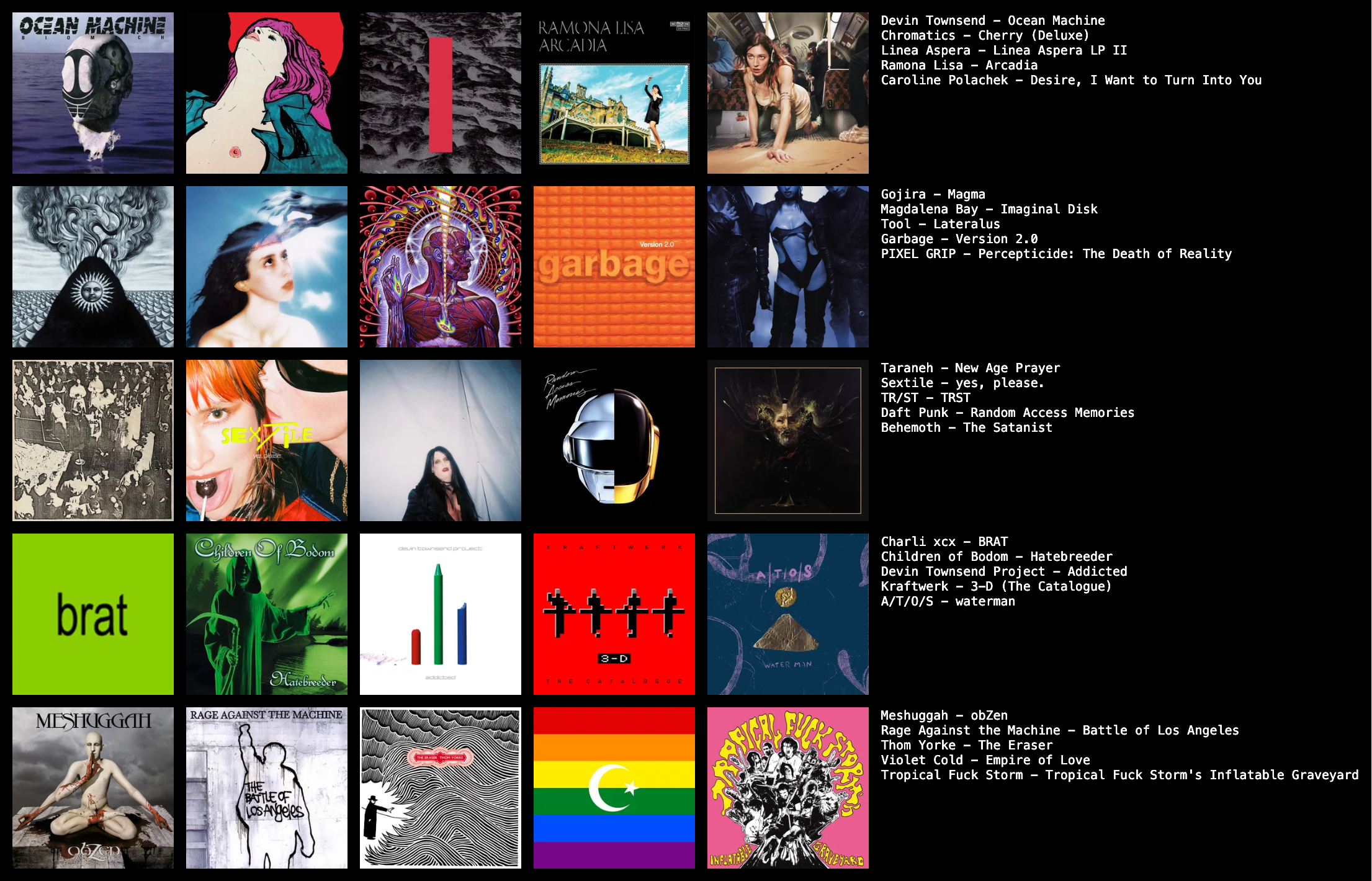 i'm not big on categorizing and tracking the media i'm into. that said, i made one of those fun album grid thingies of my favorite albums right now. ask me about any of them